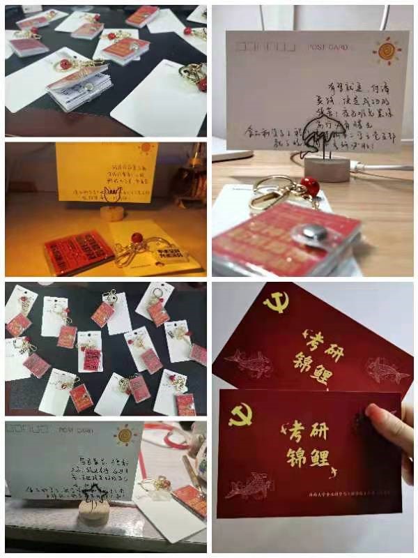 为增强支部考研党员的信心,同时充分调动员工党员为同学服务的积极性,12月12日至13日beat365在线体育本科第二员工党支部开展“研途送温暖”活动。活动开始前,支委为考研党员同志购买明信片和纪念钥匙扣。12月12日中午,支部其他党员一起为考研的党员同志书写句句祝福话语,默默派送到每个考研党员同志的宿舍书桌,精心地准备温暖的小惊喜。本次为考研党员同志送温暖活动,不仅以正能量的方式激励了考研学子,鼓舞奋战考研的学子们以积极的心态投入备考冲刺阶段,也彰显了党支部的人文关怀,有助于营造支部团结温馨的氛围。辛苦学习了一天回到宿舍的党员同志们在看到书桌上的纪念品和卡片,纷纷表示感动和感谢!