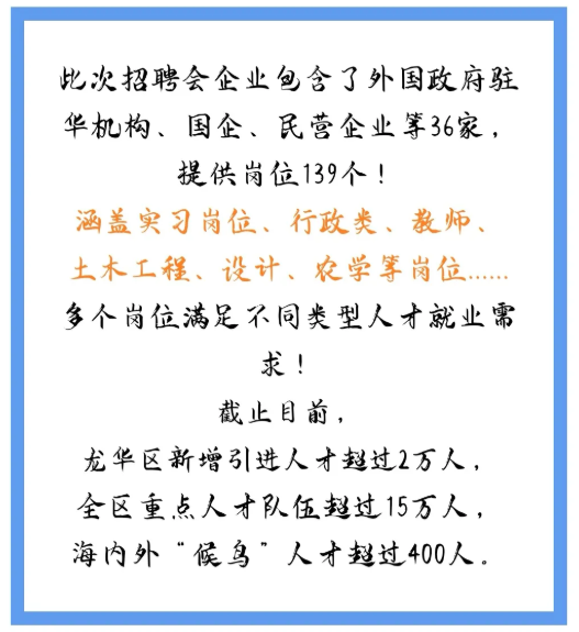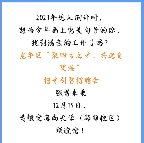 海口市龙华区2021年招才引智招聘会(beat365在线体育专场)定于12月19日(本周日)上午08:30-12:00在联谊馆举行,此次参会单位包含了外国政府驻华机构、国企、民营企业等36家用人单位单位,提供的岗位年薪均在6万以上,请大家积极参加!