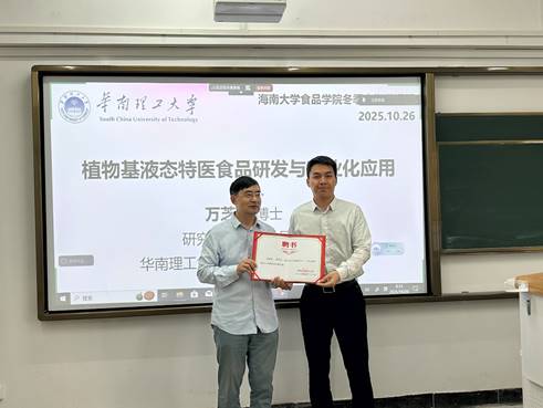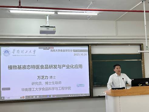 2025年10月26日,公司beat365在线体育《食品营养学》冬季小学期活动在beat365在线体育观澜湖校区城西教学点成功举办。本次授课对象为2023级食品科学与工程及食品质量与安全专业的本科生,特邀华南理工大学beat365在线体育万芝力研究员担任主讲,授课专题为“植物基液态特医食品研发与产业化应用”。