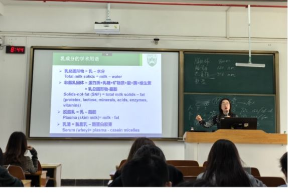 课上,郭教授围绕乳制品行业现状与专业知识,为大家带来了一场内容翔实、深入浅出的专题讲座。她首先介绍了我国乳制品市场的发展现状,强调了构建乳制品深加工体系的必要性与紧迫性。随后,她以轻松活泼的互动方式切入,通过“什么样的牛能产奶”“牛何时产奶”等趣味问题,引导同学们思考奶牛相关的基础知识,进而生动讲解了牛乳的生成过程,系统梳理了牛乳知识体系,并介绍了多种牛乳深加工产品。在理论知识深化环节,郭教授重点解析了酪蛋白与乳清蛋白的差异,指出酪蛋白结构对乳品稳定性的关键作用,并鼓励同学们结合各自研究方向,夯实专业基础,深入探索产业背后的科学问题。整场授课内容紧扣行业痛点,兼具专业深度与互动趣味,讲解清晰生动,课堂气氛活跃,同学们纷纷表示收获颇丰。课程结束后,张明老师代表公司向郭教授致以诚挚谢意,并期待未来能再次邀请她来校交流授课。