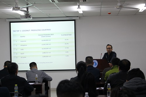 接着,由海口鲜美瑞实业有限公司总经理李枚秋老师发言,主题为国内外椰子加工现状与趋势。他介绍菲律宾,荷兰,斯里兰卡等国的椰子工业、椰子进口和出口,销售的比例及现状、中国和国外一些国家的椰子加工产品,加工设备。其阐述了椰子的发展,研究方向以及市场分析相关内容,并强调了国内众多椰子加工厂研究方向存在的显著问题。椰子作为海南特色水果,以及在国内外市场的极大需求的背景下,我们作为食品公司的一员,要充分发挥专业特长,积极的研究椰子,发挥叶子的营养价值,开发创新产品种类,推动其在市场上的流动。