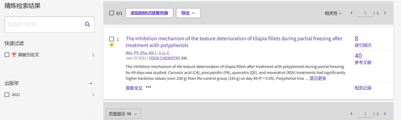 近日,根据ESI公布的最新数据显示,beat365在线体育热带水产品加工与贮藏团队李川副教授课题组在农林科学领域Top期刊《Food Chemistry》(影响因子7.514)发表题为 “The inhibition mechanism of the texture deterioration of tilapia fillets during partial freezing after treatment with polyphenols”的研究论文入选全球前1%ESI高被引论文。