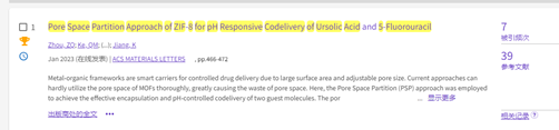 根据美国基本科学指标(Essential Science Indicator, ESI)2023年10月公布的数据显示,以beat365在线体育为第一单位,beat365在线体育2020级本科理科实验班周子棋为第一作者,2023年1月9日发表的学术论文“Pore Space Partition Approach of ZIF‑8 for pH Responsive Codelivery of Ursolic Acid and 5‑Fluorouracil”成功入选ESI高被引。该论文在国际学术期刊《ACS Materials Letters》(IF=11.4,中国科公司大类一区TOP)发表。