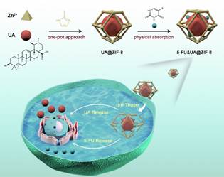 该研究通过MOFs的孔径分割策略,实现了大分子天然产物熊果酸和小分子药物5-氟尿嘧啶的高效封装与pH响应的控制释放,二者的联合递送在细胞层面展示出较好的抗癌性能。该工作探索了基于食品功能因子和药物分子的有机结合与联合递送,为癌症治疗提供了潜在的可能性。
