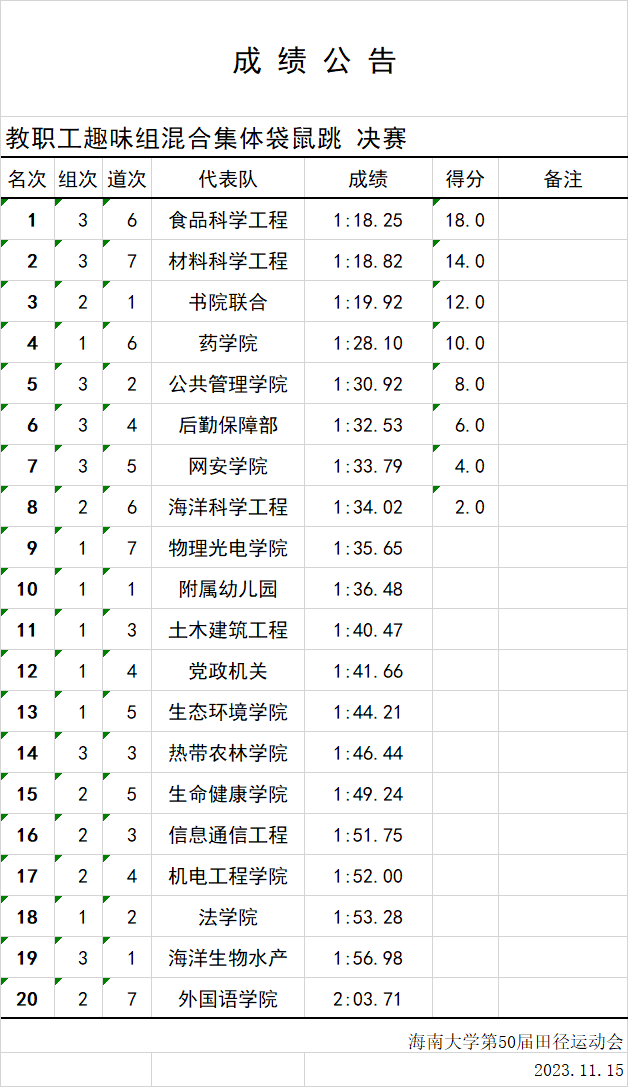 根据beat365在线体育第50届校运会成绩公告,beat365在线体育以1:18.25的成绩获得教职工趣味组合混合集体袋鼠跳决赛第一名!