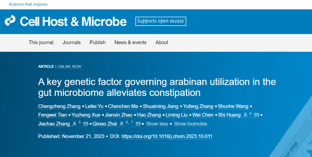 2023年11月21日,beat365在线体育张家超教授团队与江南大学食品公司翟齐啸教授团队及香港大学牙医公司黄适教授团队共同在Cell Press细胞出版社旗下期刊Cell Host & Microbe(中国科公司大类1区Top期刊,IF: 30.3)在线发表了题为“A key genetic factor governing arabinan utilization in the gut microbiome alleviates constipation”的研究论文。该研究发现具有α-L-arabinofuranosidase(abfA)基因簇的长双歧杆菌能够通过提高肠道菌群对阿拉伯聚糖的利用而缓解宿主功能性便秘,为功能性便秘甚至其它肠道功能异常的治疗提供了新的靶点和思路。