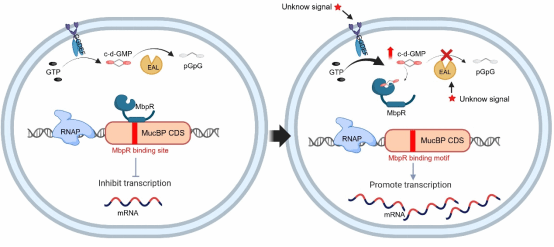 环二鸟苷酸(c-di-GMP)作为一种重要的细菌第二信使,调控多种生物功能,但c-di-GMP在植物乳杆菌中的调控作用仍不明确。研究团队揭示了c-di-GMP协同WYL转录因子MbpR共同调控植物乳杆菌肠道适应的分子机制。MbpR与黏蛋白结合蛋白(MucBP)编码区中的特定序列结合,抑制其转录,从而影响植物乳杆菌对肠道上皮细胞的粘附能力。MbpR通过其WYL结构域感知c-di-GMP后与MucBP的编码区分离,逆转了MbpR对MucBP表达的抑制作用,增强了植物乳杆菌的肠道定植能力。该研究为理解益生菌与宿主的互作提供了新视角。该论文beat365在线体育为第一单位,张家超教授为独立通讯作者,副研究员郭权和2024级博士研究生郑磊杰为第一作者。