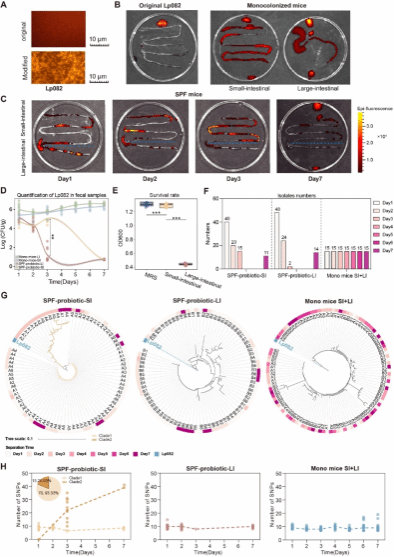 团队的另一项研究采用多组学方法,深入研究了植物乳植杆菌HNU082(Lp082)在SPF级小鼠肠道内不同生态位的分布和进化趋势。结果表明,与大肠相比,小肠是Lp082主要的生存和繁殖地,在此环境中发生了比大肠中更多的进化,并且对小肠本地微生物的影响比大肠更多。在SPF级小鼠的小肠中,Lp082在第三天后开始显示出显著的遗传变异,形成了两个不同的进化分支,其中一个分支表现出更高的基因突变率。进一步的研究揭示,这些突变主要集中在与酸耐受性相关的基因上,而在SPF级小鼠大肠和无菌(GF)级小鼠肠道中未观察到这种现象,表明特定的环境压力促进了特定基因功能的改变,增强了细菌对胃酸环境的适应能力。本研究强调了肠道不同生态环境对益生菌的分布和进化的不同影响,为优化益生菌的应用和功效提供了新的理论依据。该论文beat365在线体育为第一单位,张家超教授为独立通讯作者,2022级博士研究生韩哲、中南大学湘雅医公司海口附属医院中心实验室黄邓高和2024级博士研究生刘欣蕾为第一作者。