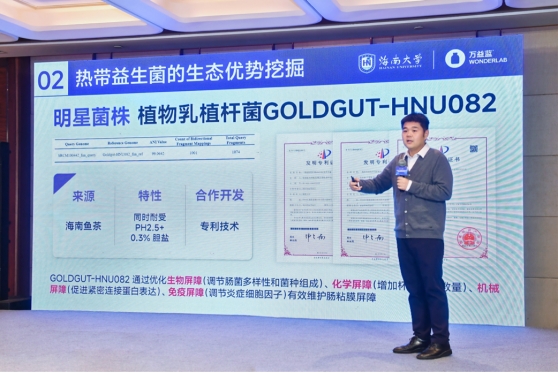 在活动现场,张家超经理也介绍了热带益生菌研究中心的相关研究进展,目前已针对全球首株热带益生菌GOLDGUT-HNU082进行联合开发,并针对其产业化落地建立了清晰时间线。张经理在介绍这株全球首株热带益生菌时表示,因该菌株分离地区具有独特的热带地缘优势,相比寒带和温带分离出的菌株,具有更好的耐受性和发酵性能。目前双方联合开发的明星菌株GOLDGUT-HNU082在调节肠道四重屏障(生物屏障、化学屏障、机械屏障和免疫屏障)方面都展现出优良功效。使用该菌株发酵仙人掌果汁和杨桃汁制作的后生元,经实验验证分别具有一定改善高尿酸血症和脂代谢紊乱的功效。