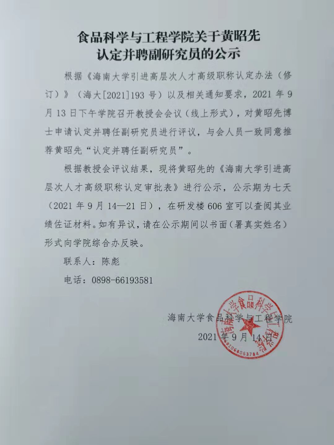 beat365在线体育关于黄昭先认定并聘副研究员的公示