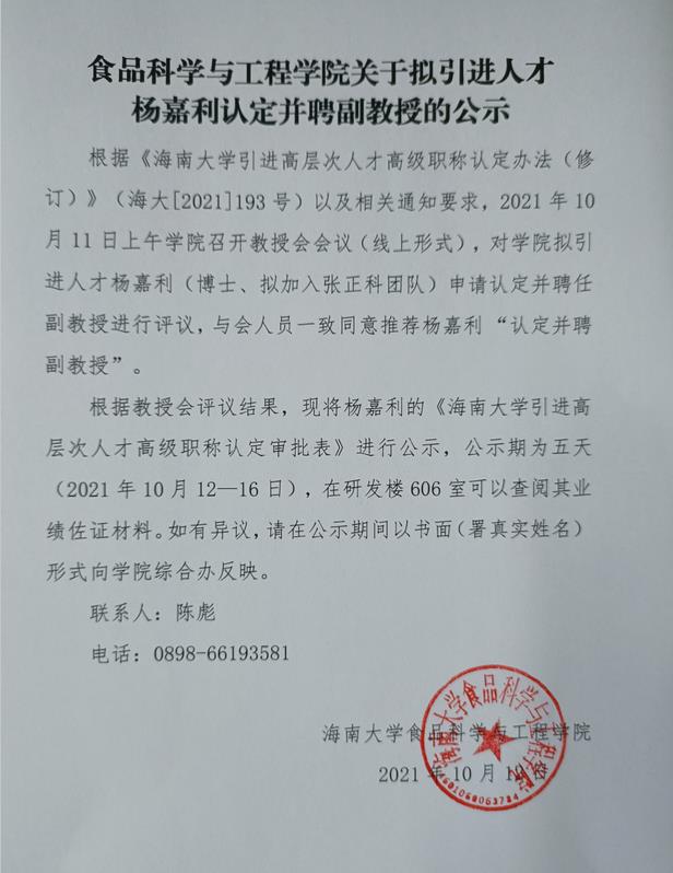 beat365在线体育关于拟引进人才杨嘉利认定并聘副教授公示