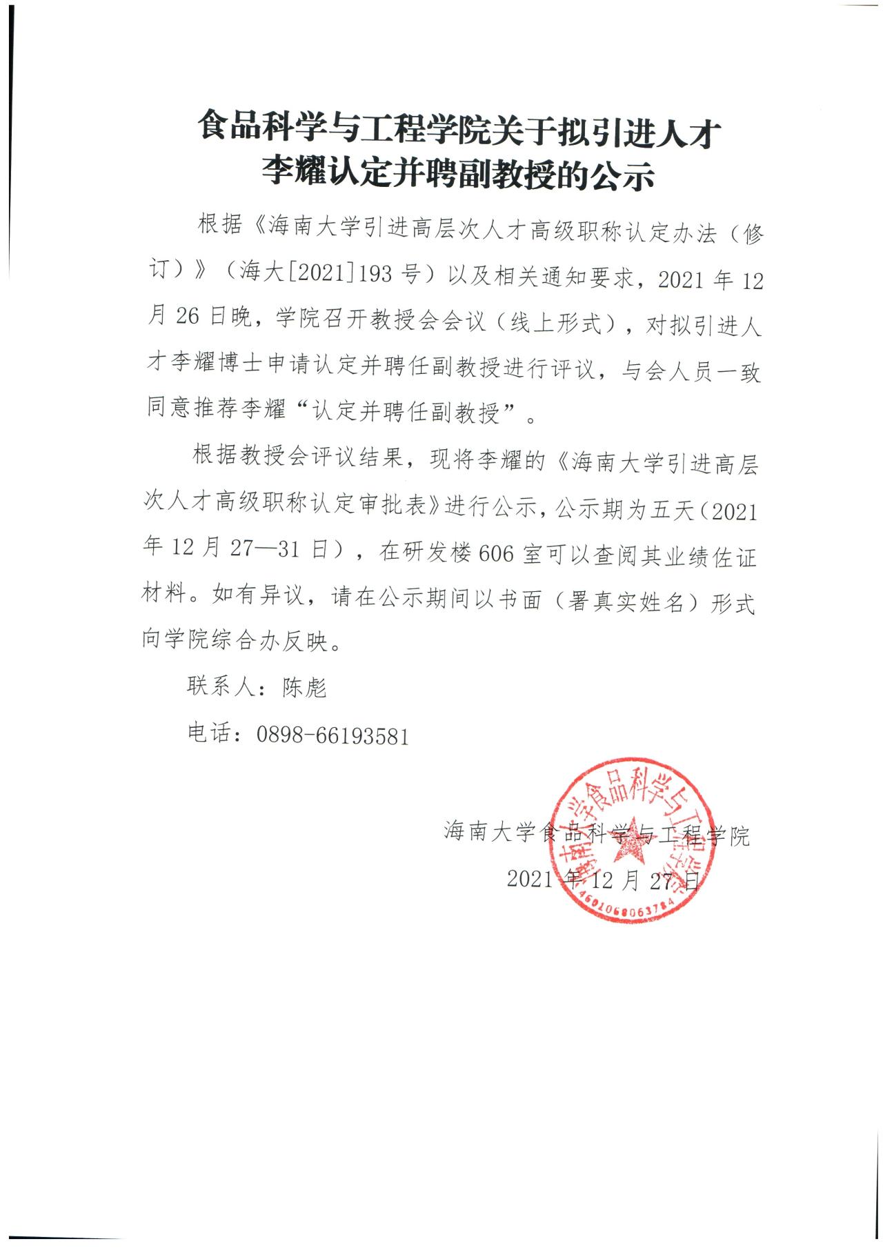 beat365在线体育关于拟引进人才李耀认定并聘副教授公示
