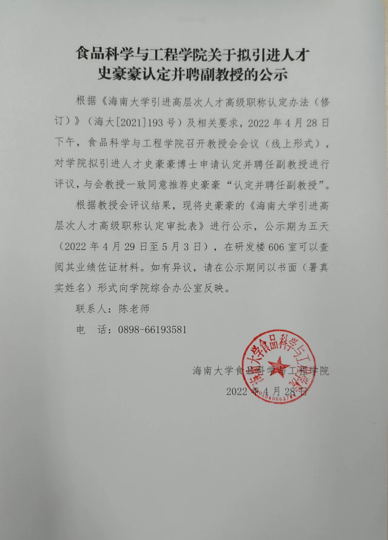 beat365在线体育关于拟引进人才史豪豪认定并聘副教授公示
