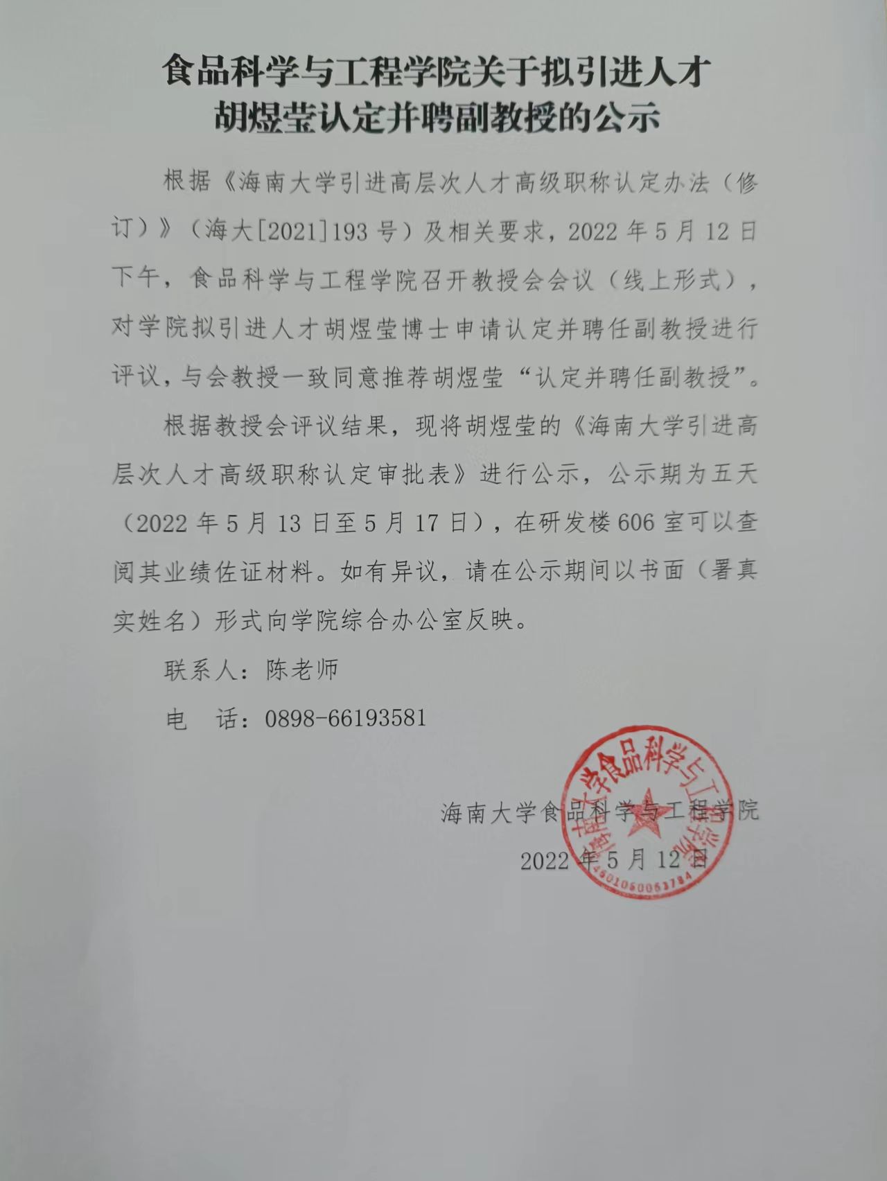 beat365在线体育关于拟引进人才胡煜莹认定并聘副教授的公示