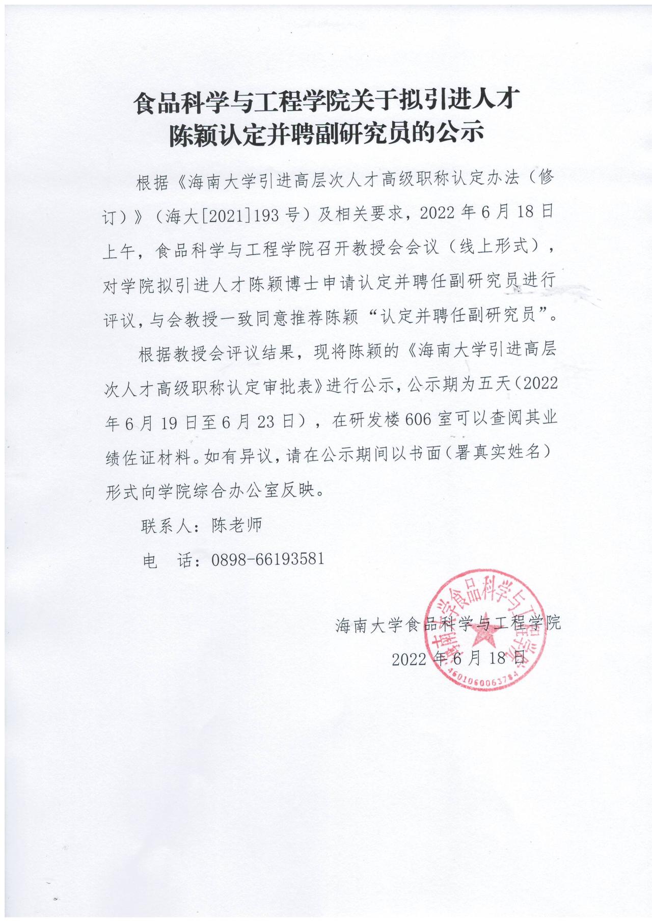 beat365在线体育关于拟引进人才陈颖认定并聘副研究员的公示
