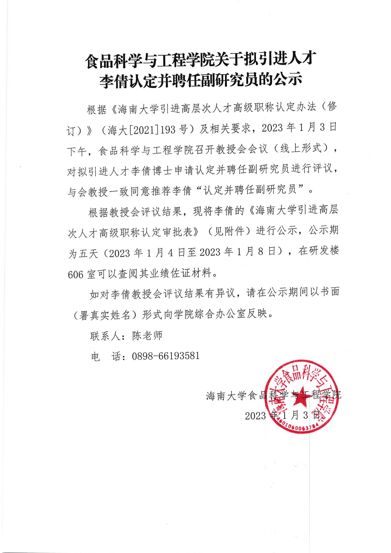 beat365在线体育关于拟引进人才李倩认定并聘副研究员公示
