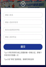 ● 比赛时间内,高校员工登陆小程序答题,需要填写员工地真实姓名、所在高校全称、手机号码、所学专业等信息,每个手机号码有且仅有一次参赛答题地机会。